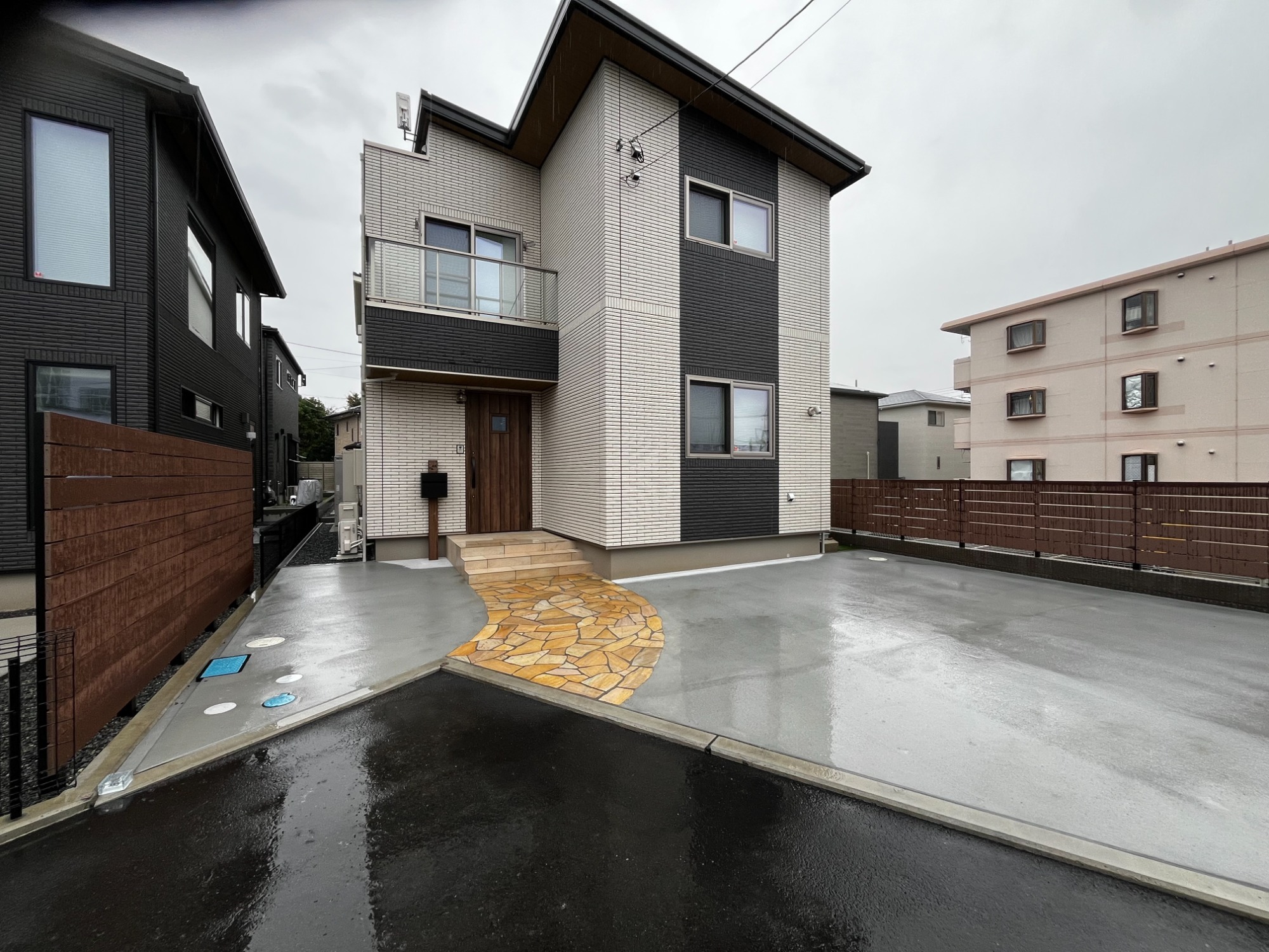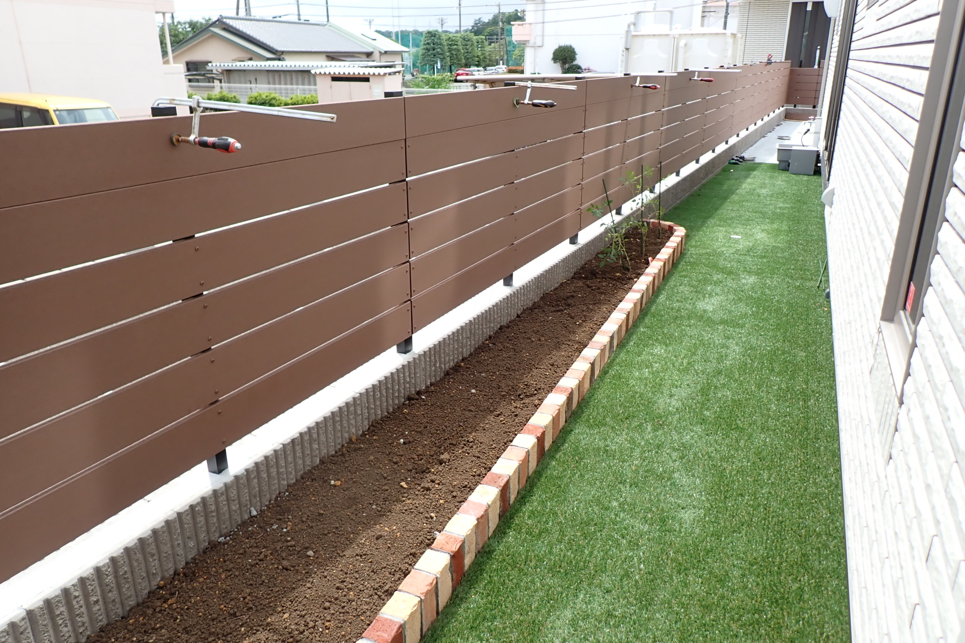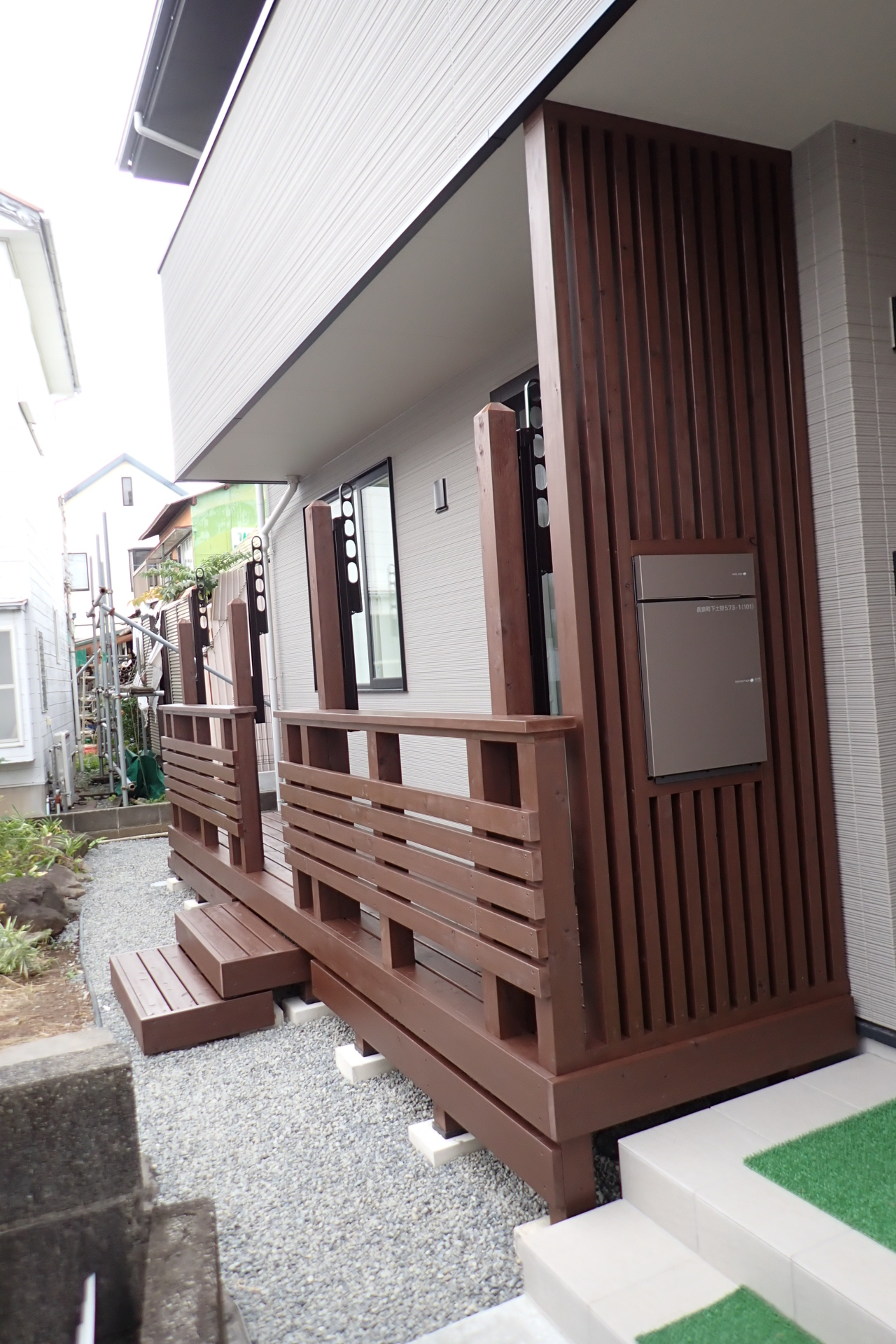 玄関アプローチは「鉄平石」 フェンスは「エコモック」